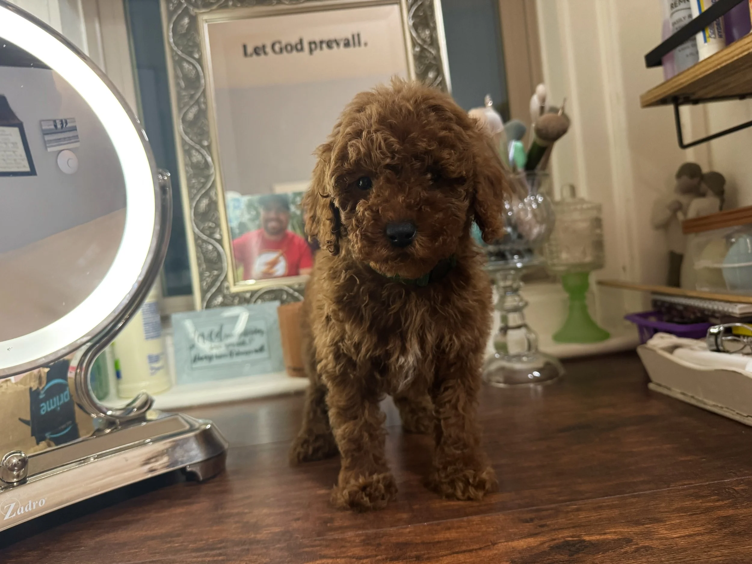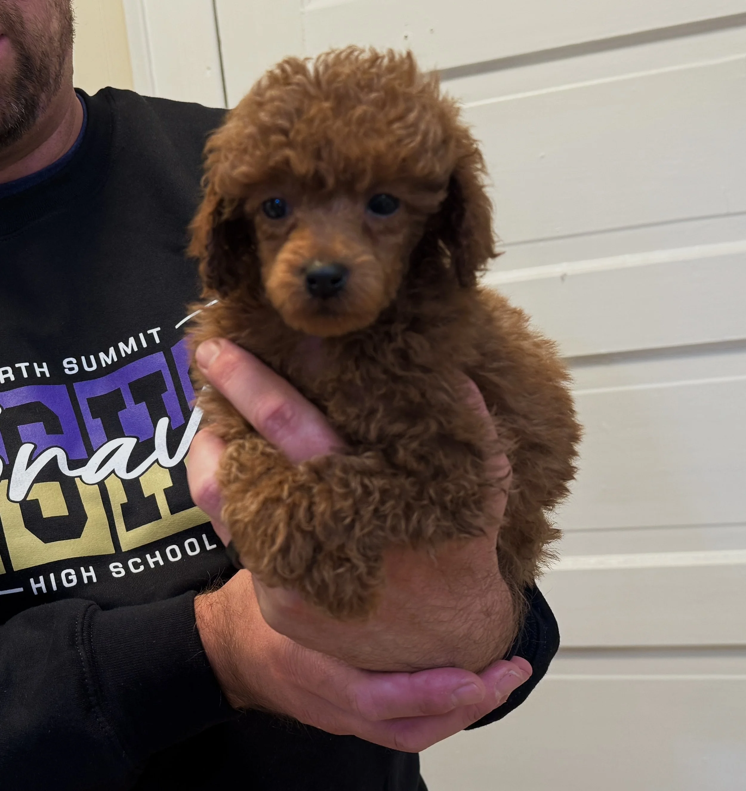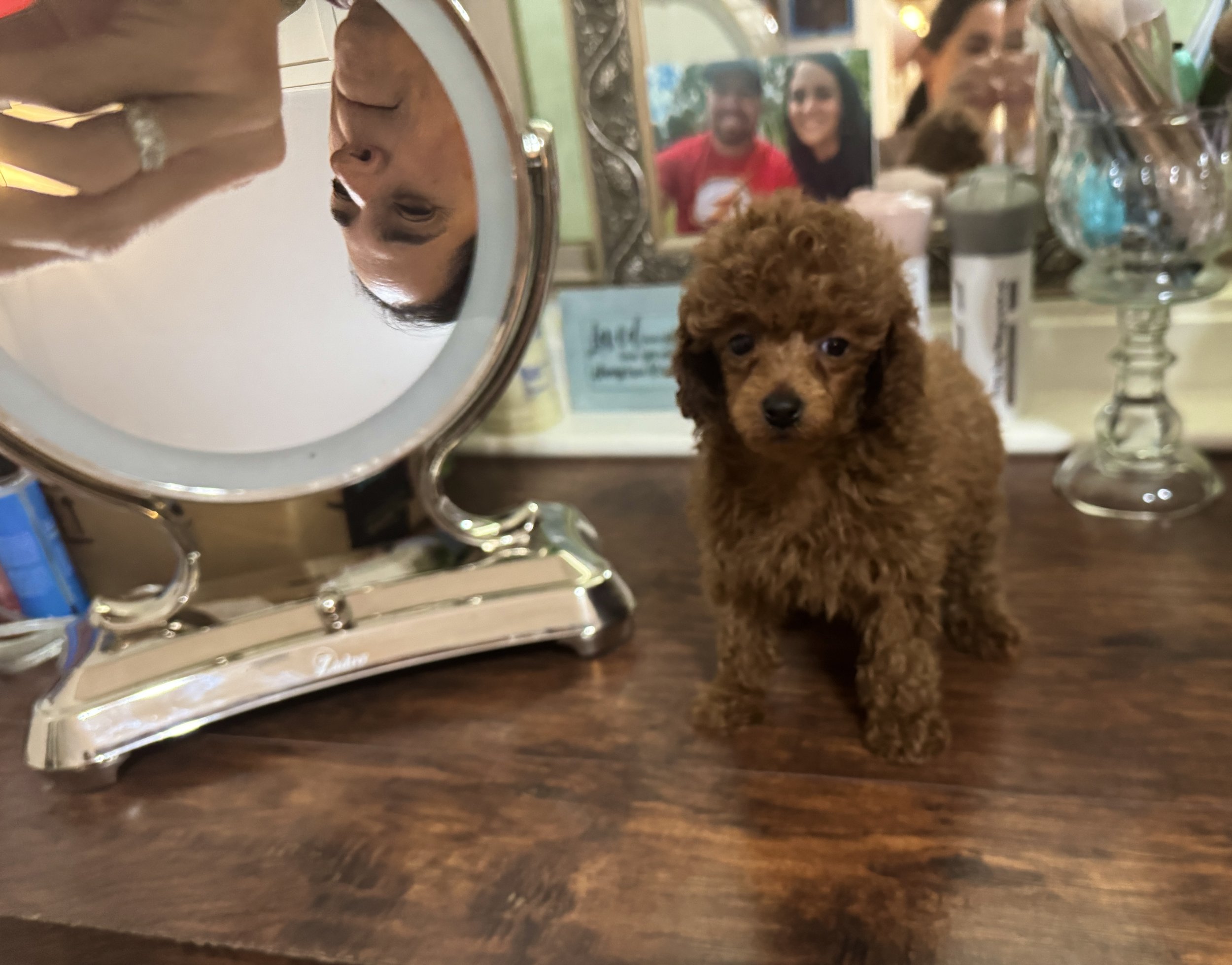 Miss Lottie and Goose have welcomed 7 beautiful Red abstract Miniature Poodle babies on October 5th, 2025! These darlings will be ready to come home to you beginning November 26th, 2025. we currently have 2 females and 2 male spots open for deposits!