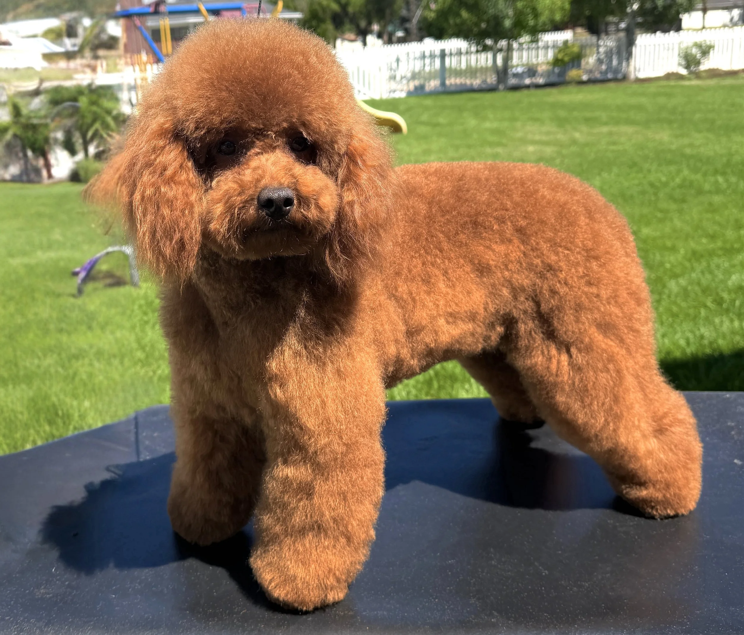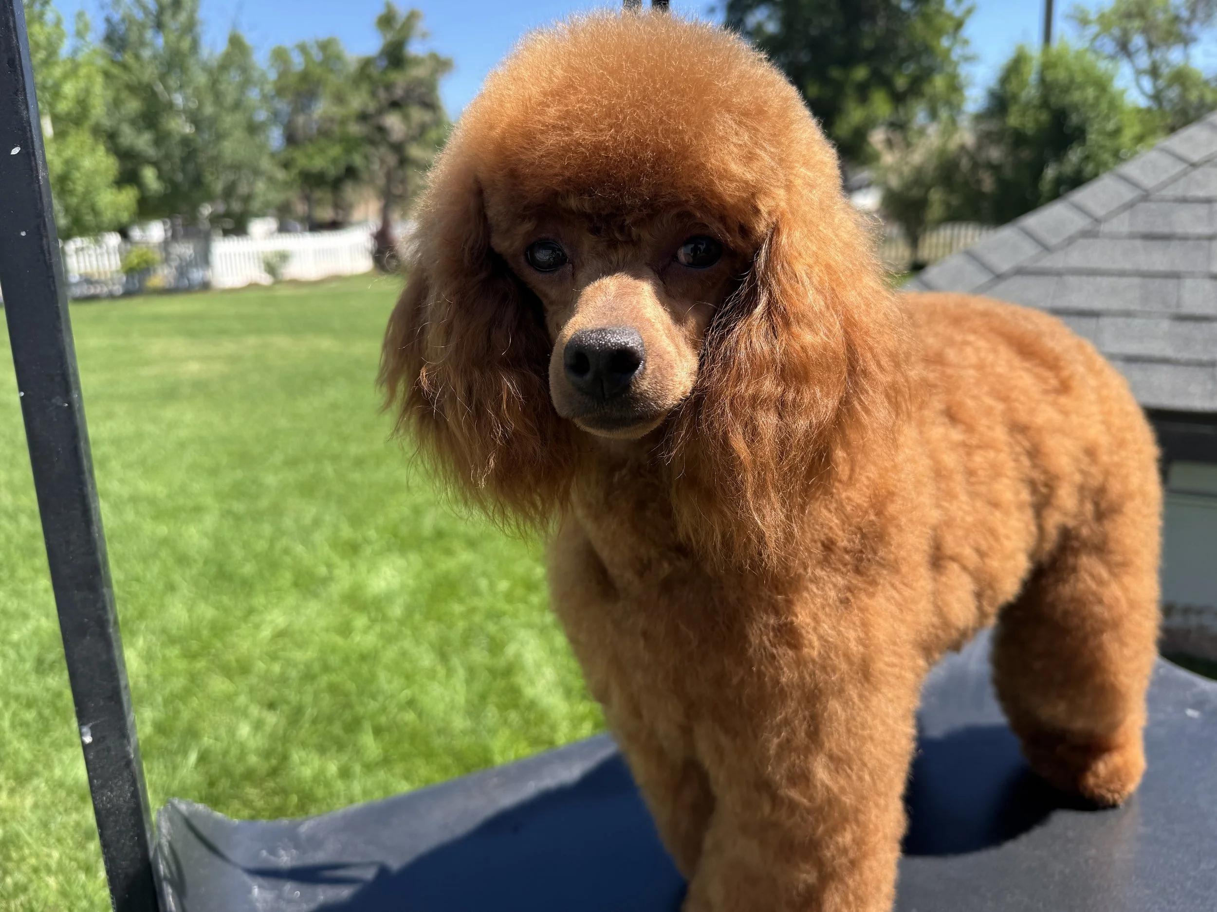 Little Lottie is a red AKC registered Miniature Poodle, carrying the hidden phantom gene. She is 14 inches at the shoulder, and 14 lbs. She is SO happy and sweet and excited to learn and be part of the family. She brings so much fun to our little crew!