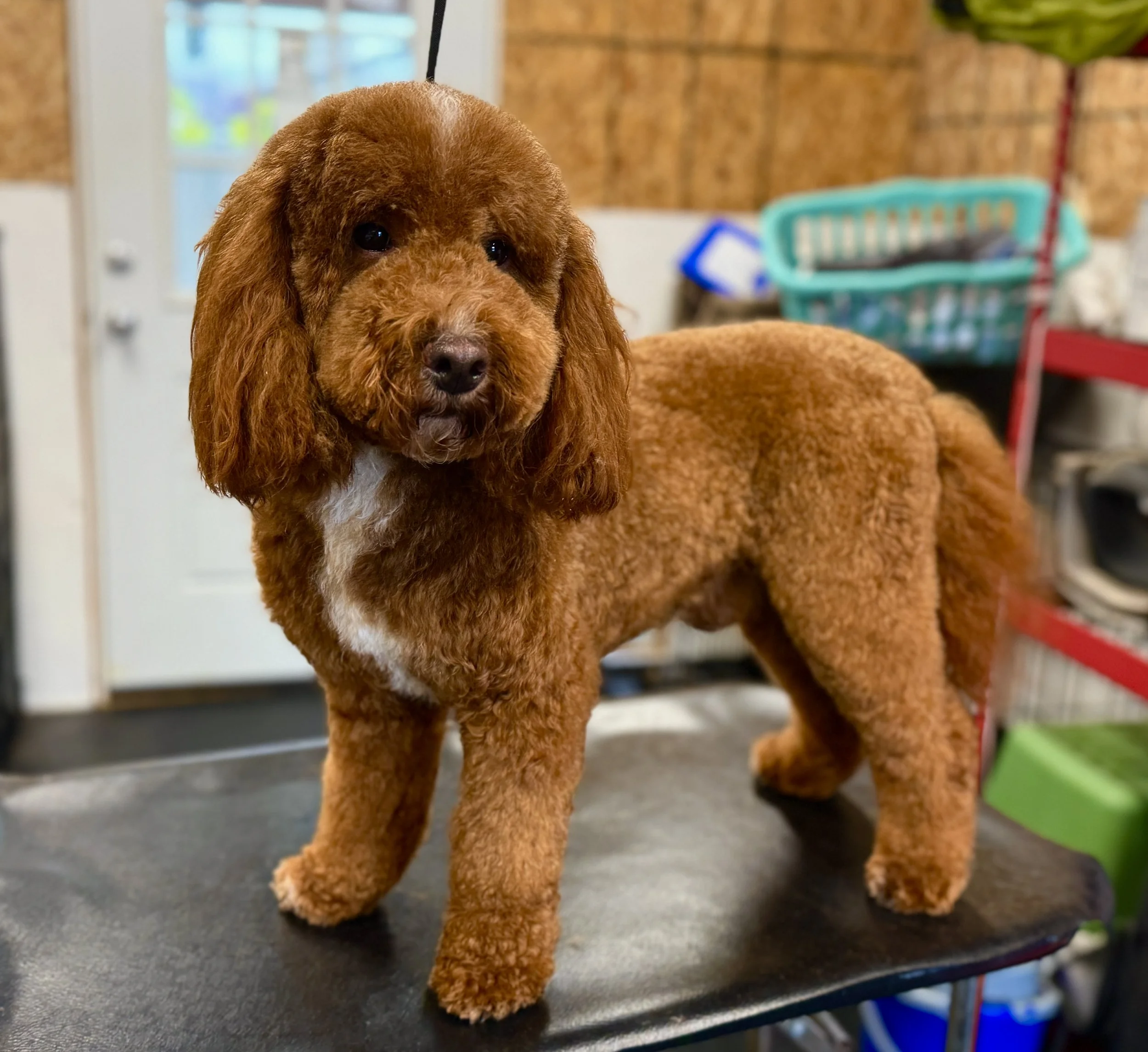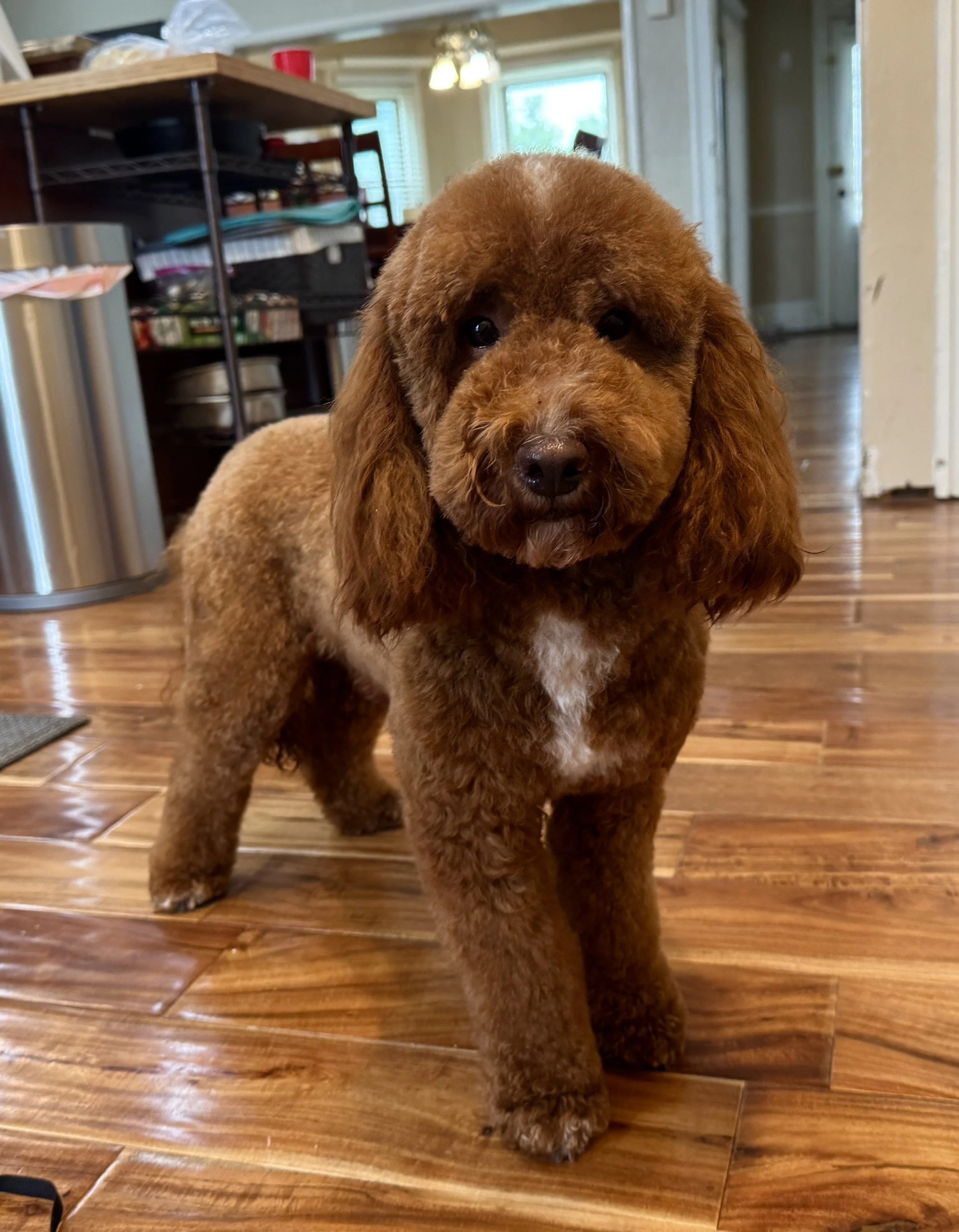 Goose is an AKC DEEP red abstract Miniature poodle, who carries the irish spotting gene. He is DNA tested through Canine Health Check and is 100 % clear with 1 of IVDD and O CDPA. His hips patellas and eyes testing can all be seen on his profile linked below.